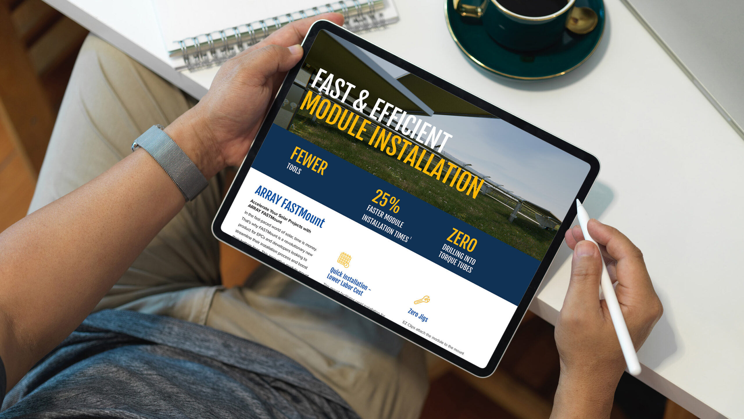 Accelerate your solar projects with ARRAY FASTMount. Designed to make module mounting a breeze. FASTMount combines intuitive designs with our patented EZ clip technology for improved productivity.